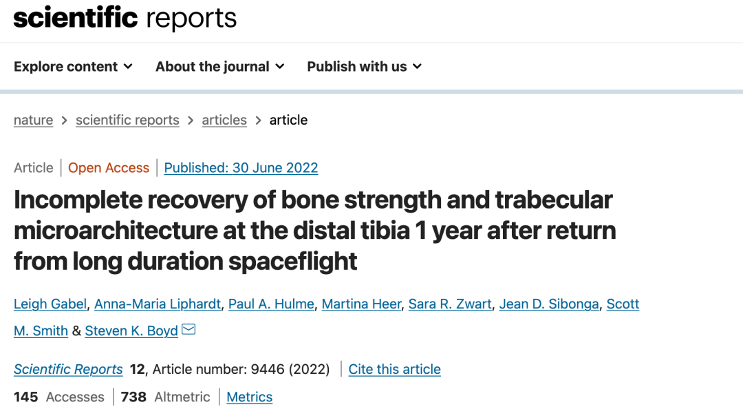 相关研究论文以“ncomplete recovery of bone strength and trabecular microarchitecture at the distal tibia 1 year after return from long duration spaceflight”为题,已发表在科学期刊《科学报告》(Scientific Reports)上。