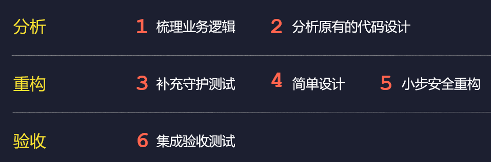 首先需要去梳理原有的业务逻辑,这一点非常重要,因为很多遗留系统的业务和逻辑都是有一些缺失的,所以第一步要去梳理业务逻辑。第二个是分析原有的代码设计,从中识别一些代码设计的问题。第三个,开始动手做安全重构时,建议先补充守护测试,做一层简单的防护网。