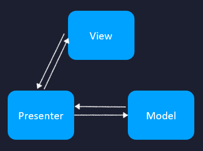MVC第二种是 MVP 模式,MVP 模式跟 MVC 模式的主要的区别是 MVP 模式中 View 跟 Model 没有直接交互,它们是通过中间的Presenter以及一些接口的设计来达到双边的交互。