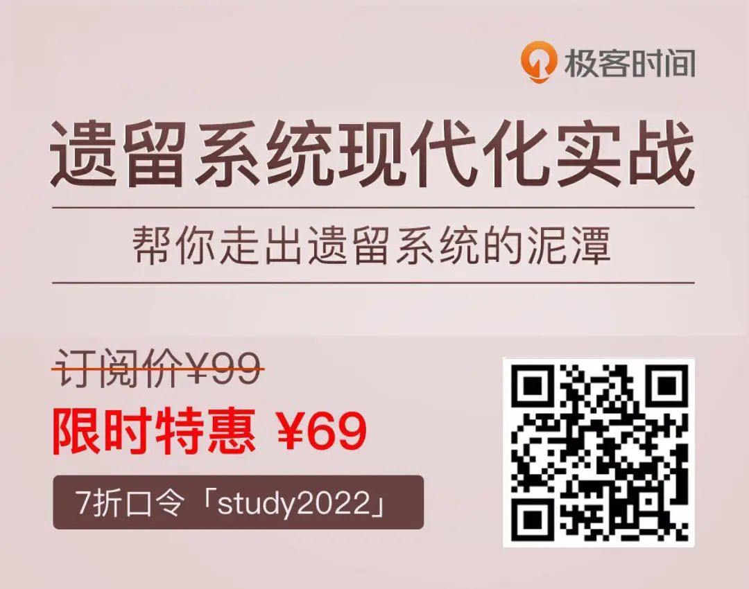 遗留系统一直是技术领域的“重灾区”,想要深入剖析遗留系统的特点和问题,推荐你学习这门专栏,它将从代码、架构、DevOps 和团队现代化四大方向,解决遗留系统治理的疑难杂症,帮你和所在团队走出遗留系统的泥潭。使用口令现仅 7 折入手,等你来品鉴!