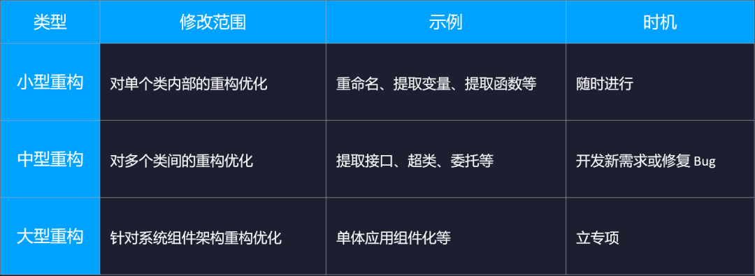 首先第一个问题,没有时间进行重构。其实我们更应该把重构按不同的修改范围去分类,在这里我们将重构分为了三种类型:小型重构、中型重构和大型重构。