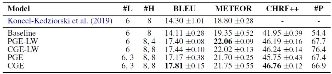 下表是在数据集WebNLG上的实验结果。CGE比之前的最好模型在BLEU值上高5-6个点,在METEOR上高2-3个点,表明其生成文本的拟合度是显著更好的。