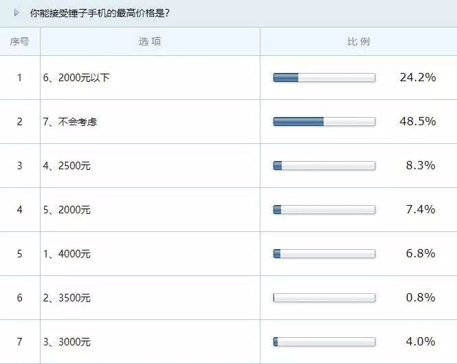 他先是做足了工匠精神的自我包装,然后在微博发起调查,结果12万参与者有36.7%接受4000元以上的定价,当锤子T1发布时,再让价格回到3000元区间,以营造高配低价的印象。但在其他媒体的调查中,48.5%受访者表示任何价格都不考虑,2000元以下才会考虑的有24.2%,接受4000元以上价位者只有6.8%。