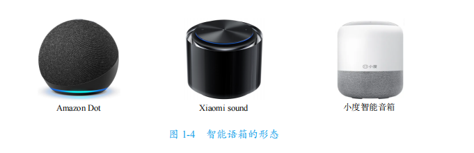 相对于传统的控制、交互形式,在智能家居领域中使用语音交互对于用户会更加便捷。亚马逊、谷歌、百度、小米、阿里巴巴等企业都先后发布了自己的智能音箱产品。目前,智能音箱作为所有智能家居交互的入口,扮演着一个非常重要的角色,且不用附加在一些重服务家电上。除了常规的日程设置、音乐播放、天气等信息查询,智能音箱还可以控制灯光、空调、电视、窗帘、门窗、安防与监控等。未来的家居场景,是全屋产品的智能化,届时语音与其他技术会更加深度地融合。图 1-4 展示了几种智能音箱的形态。