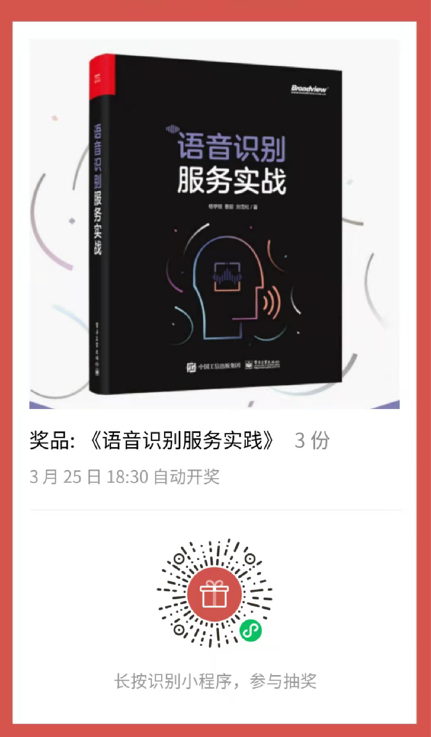 AI 前线为粉丝准备了《语音识别服务实践》纸质书籍 3 本!长按识别下图小程序,参与抽奖活动,由小程序随机抽出 3 位,每人赠送一本书。开奖时间:3 月 25 日(下周五) 18:30,获奖者每人获得一本。