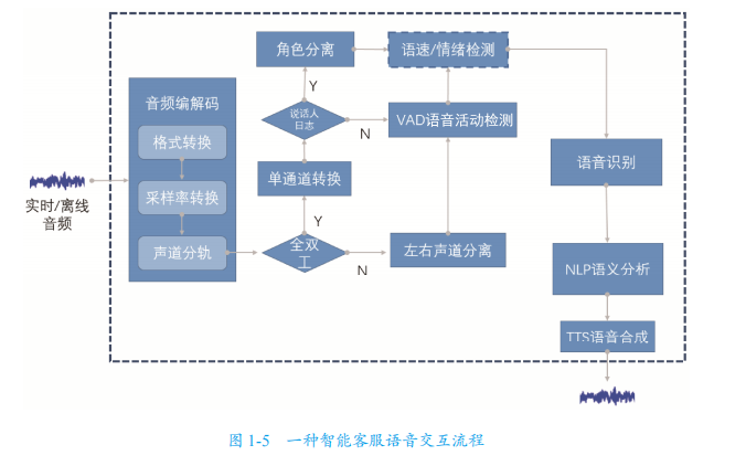 语音质检普遍被应用在智能外呼和客服领域。通过语音识别与声纹识别的相关技术,不仅可以对客户说话的内容进行语音语义分析,挖掘客户潜在需求,进行用户画像,提供个性化的客户服务与产品的精准营销,还可以对对话内容的合规性进行稽核与审查,进一步提升服务满意度。一个完整的智能客服语音交互流程,如图 1-5 所示。