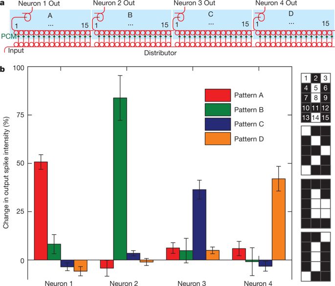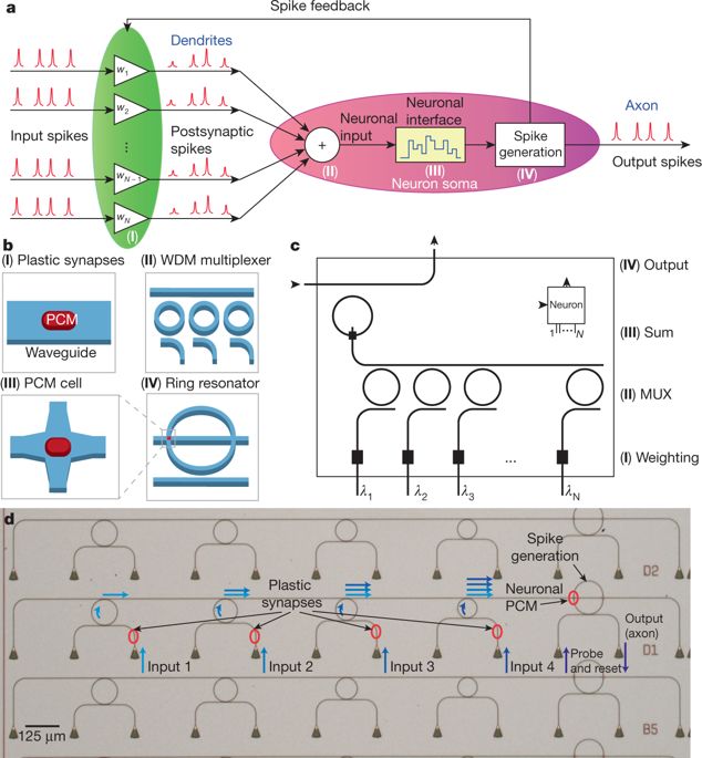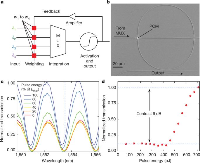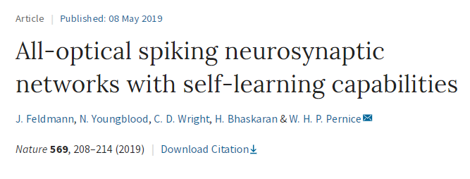 Feldmann研究团队在毫米级光子芯片上实现了“全光学神经网络”,其中网络内没有使用光电转换。输入的数据被电子调制到不同的波长上注入网络,但此后所有数据都保留在芯片上。利用集成相变材料实现突触权重的调节和神经元的集成。