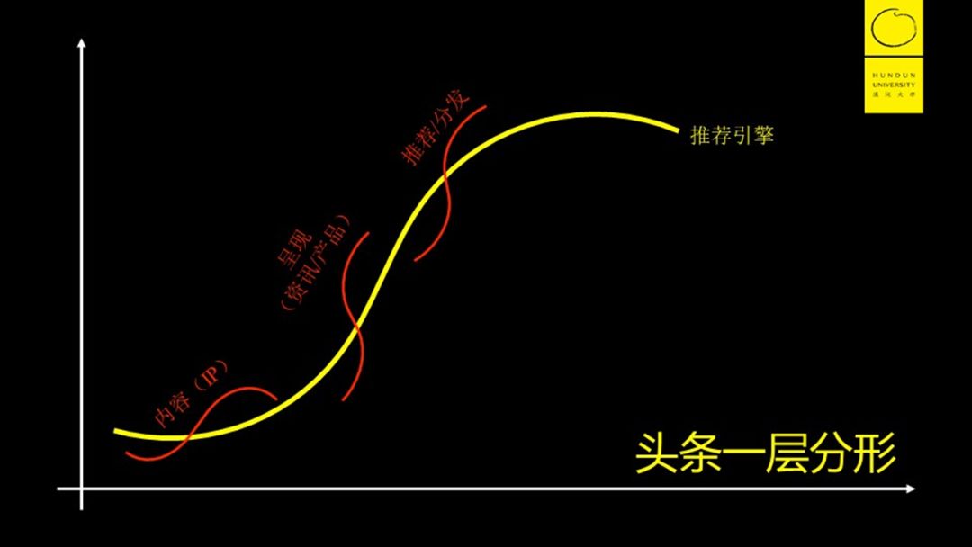 在第一曲线上求分形,它的分形里有两层甚至三层,第一层分形,有内容上的分形:社会新闻、政治、体育、娱乐等,第二层有呈现形式上的分形,有文字、图片、视频等。