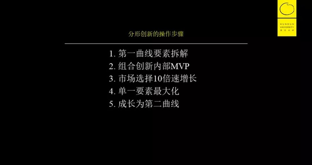 分形创新有很多步骤,其中一步是第一曲线要素拆解,然后用组合创新的方式在内部做MVP(最小可行化产品),通过市场选择其中10倍做增长的要素,然后把MVP中的第一要素最大化,把它成长为新的第二曲线,这是分形的步骤。