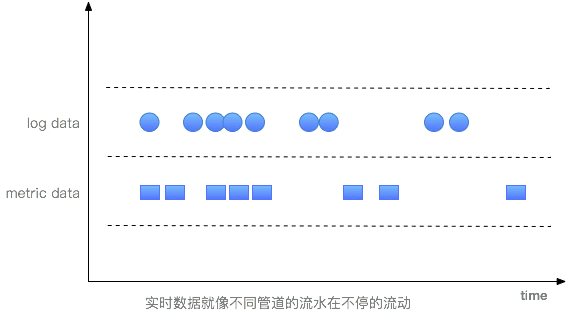在实际的系统运行过程中,随着时间的推移,日志数据以及监控数据是源源不断的在产生的。每条产生的数据都有一个自己的时间戳。而实时传输这些带有时间戳的数据就像水在不同的管道中流动一样。