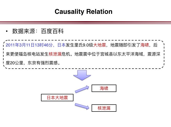 比如我们一说到地震,就会有可能想到震中、时间、地点,当然也会想到它的一些子事件,比如抗震救援,但是也不能一刀切,实体和关系在我们脑海当中也是存在的。