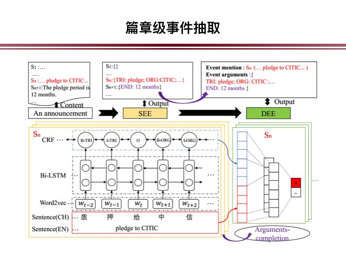 先做一个句子级的抽取,采用一个序列标注的模型,双向LSTM+CRF。但很多情况下一个事件是由篇章当中的不同句子去描述的,你需要从不同的句子当中抽取出来对应的元素,去构成一个这样的一个完整事件,那么你就要从多句话当中,识别出来哪个是主句,这个是用一个 CNN 分类的模型去做的,模型中不仅考虑了文本特征,还同时考虑了对于那个句子分析的结果。找到主句以后,这一个主句有可能描述得不全面,你又从它上下文档中,把对应的角色给补齐。