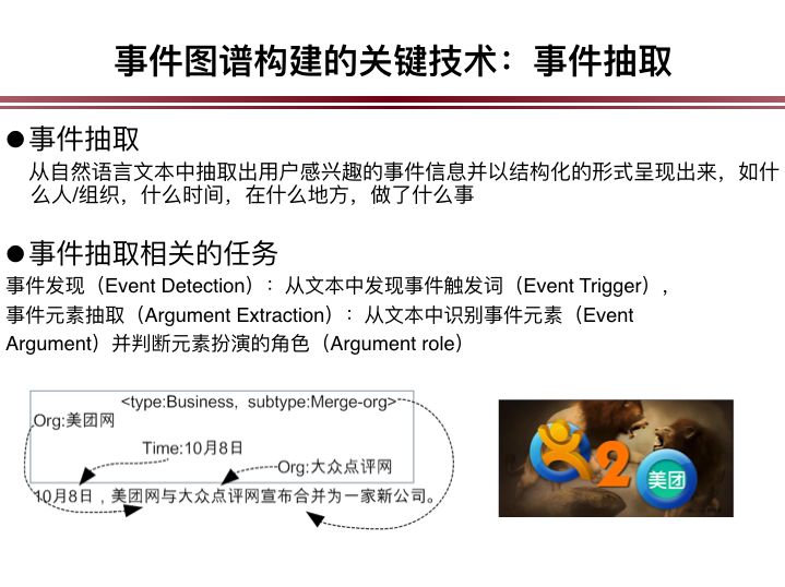 然后是事件元素抽取,就是说你要让计算机判断出参与这个事件所有的元素是什么,并且它们在这个事件当中扮演一个什么角色,比如说美团和大众点评合并这样一个事件,其实它描述的就是一个公司合并事件。美团和大众点评在这里就是两个参与者了,10月8日就是合并事件发生的时间,这是我们希望计算机能自动从文本当中提取出来的。