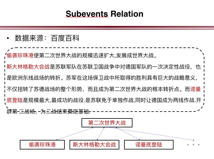 同一个类型的事件中不同粒度的元素代表不同粒度的事件。事件之间其实有很多关系,其中子事件就是一个比较有代表性的,同样是战争类型的事件,持续的时间或者元素的粒度不一样,就有二战、抗日战争和淞沪会战之分,它们是不同粒度的事件。