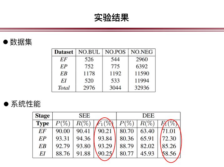 我们针对冻结、回购、增减持,还有质押这四个事件类型做了一个简单的实验,在我们比较擅长的句子级事件领域,平均做到了大概 F 值 90% 左右,但是如鲍老师所说,其实这个 90%多的性能的系统到实际应用,还需要大量的工程和工业界的努力。