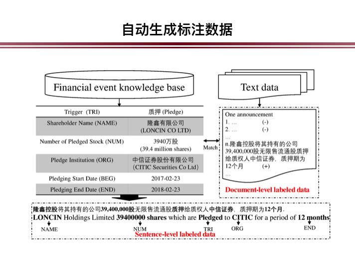 针对这两个挑战,我们做了两个任务,第一个就是自动生成标注数据,利用现有的一些结构化的事件信息,然后去公开文档当中自动生成标注数据。
