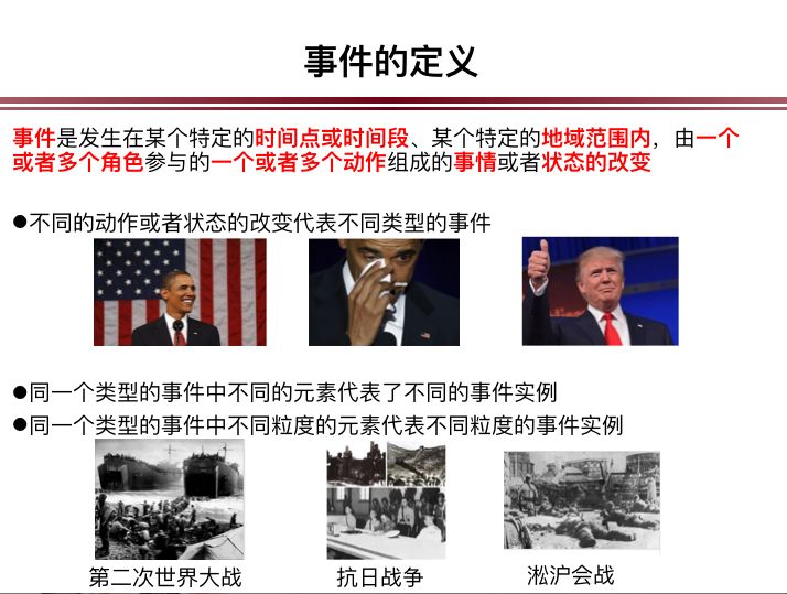 在知识图谱领域,事件是发生在某个特定的时间点或时间段、某个特定的地域范围内,由一个或者多个角色参与的一个或者多个动作组成的事情或者状态的改变