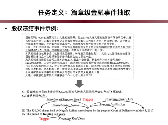 了解了事件的建模、事件图谱的关键技术之后,接下来给大家讲讲我们在金融领域做的尝试——篇章级金融事件抽取。主要解决的问题是如何从金融公告当中抽取出结构化的事件信息,比如说抽取出冻结、质押、增减持等公告。