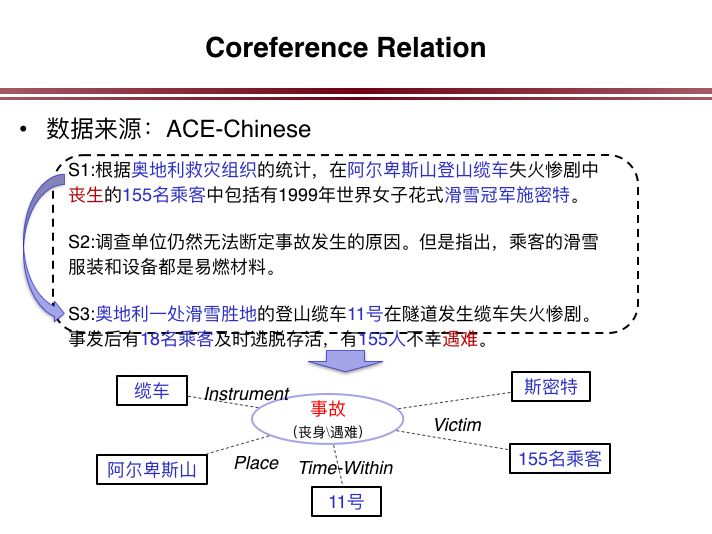共指。比如说一个事件你会有不同的新闻来源,去描述它不同的侧面,如果识别出这些不同的描述,描述的都是同一个事件,就能判断这是共指关系,这样你就能从各个角度全方位地去认识这个事件,并且追踪这个事件。