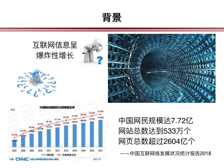 现在互联网信息呈爆炸性增长,据中国互联网中心2018年发布的数据显示,截止到2017年12月,网民规模达到了7.72亿,网页总数也超过了2600亿。如何快速地去获取海量信息当中所需要的知识,尤为重要。