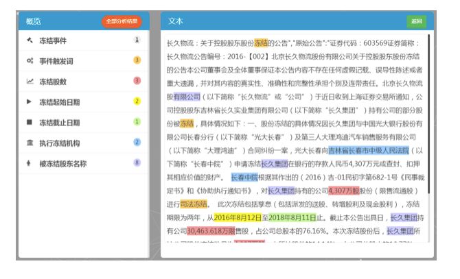 分析完以后,找到主句,然后再上下文补齐,例如图片中的例子中整篇公告描述的是一个冻结的事件,但是主句子只描述了4个角色,而完整的冻结事件至少要提取6个角色,主句中缺乏的是起始和结束时间,这两个元素需要从别的句子当中补齐,最终结果如demo页面2所示。