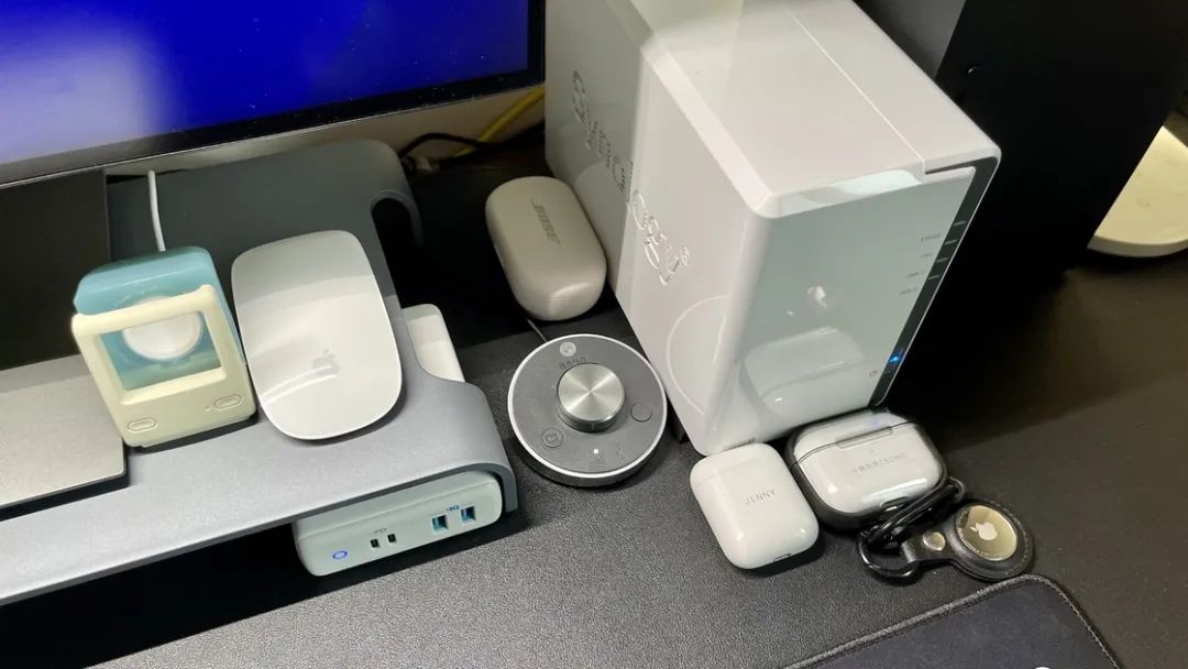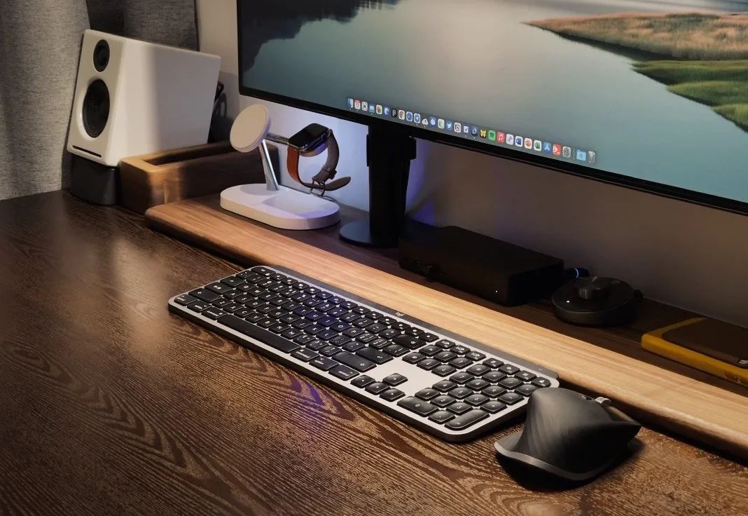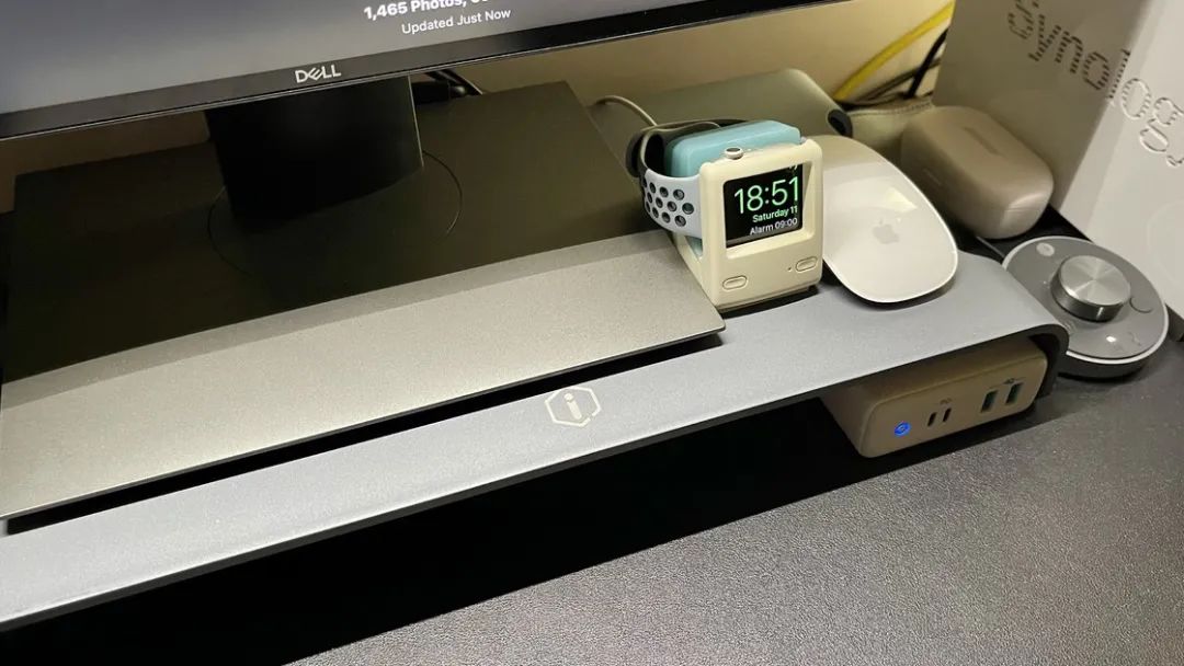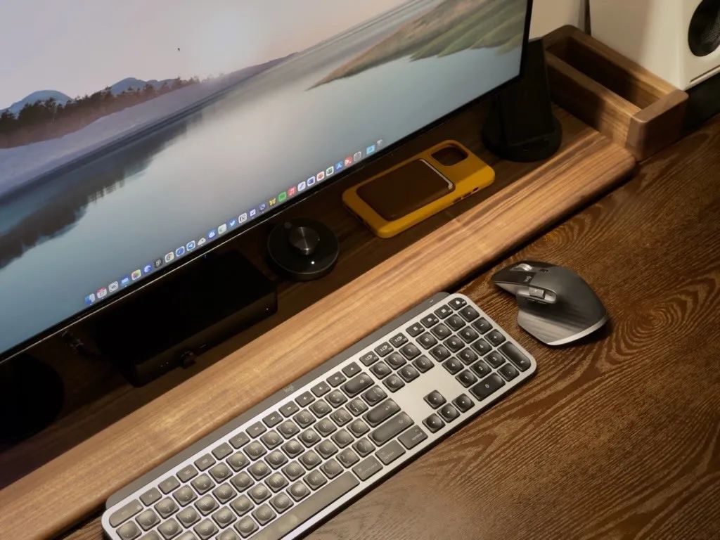 显示器下方的支架是 iQunix Spider,钛灰的颜色与 Mac 的深空灰很相近,深得我心。底部的收纳空间也比较充裕,平时我会在右侧放一个 Anker 的100 W 四口充电器,主要负责给不支持无线充电的设备充电。上面是 elago 模仿 iMac G5 造型的 Apple Watch 硅胶充电支架和一个与 Mac 配对的 Magic Mouse。