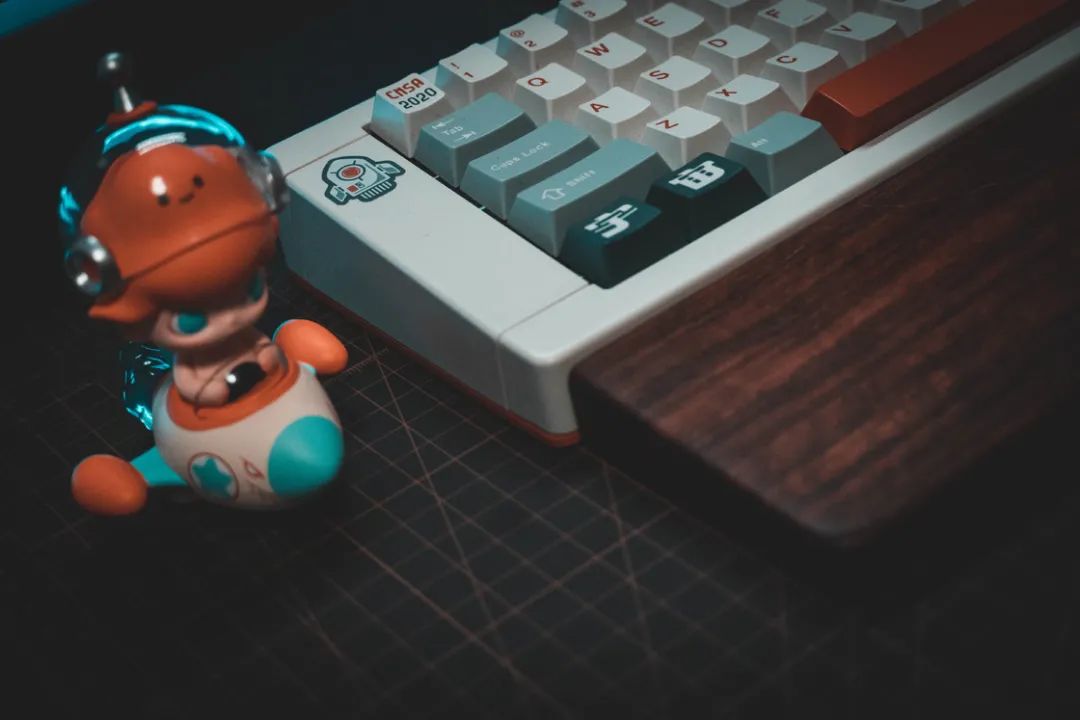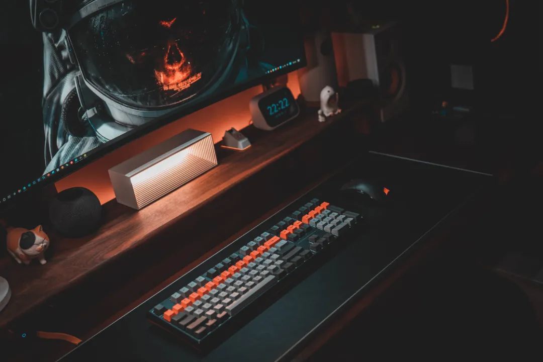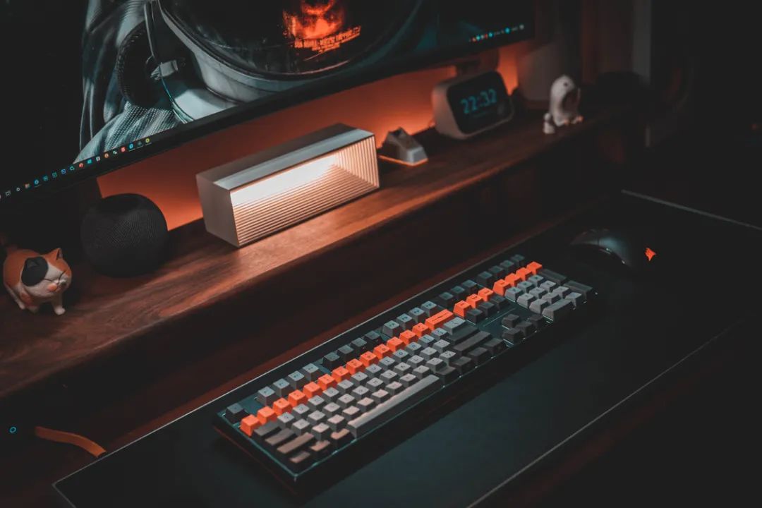 再比如这套橙色灯光其实是想营造关于「火星」的主题,所以会加入了很多太空的元素,比如天问一号主题键盘,Dimoo 的太空旅行系列手办等等: