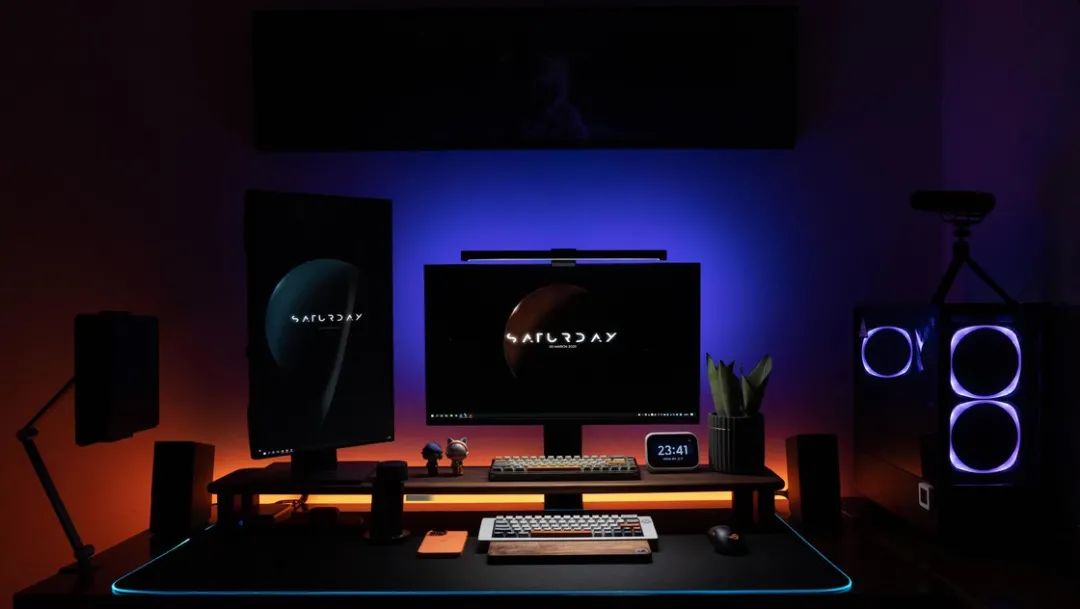 这样的选择主要有两个原因,其一是我自身对于张牙舞爪的设计风格的确不太感冒,感觉很难融入家庭环境中;另一个原因则是,仅通过灯光+壁纸的调节,我可以让桌面实现一个比较基础且快速的风格转变,比如下图是我在更换带鱼屏之前的一次风格对比:
