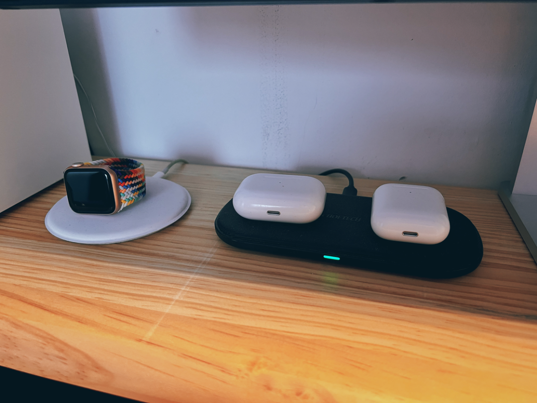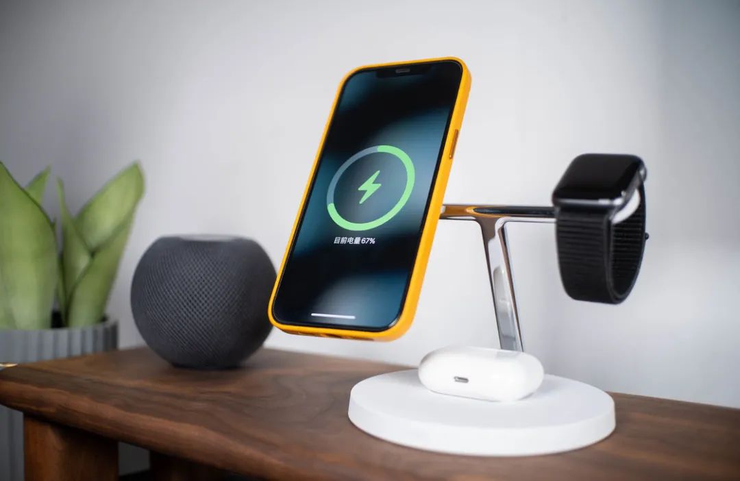 第一个想法是更换一些更加集成且优雅的无线充电设备,尤其是iPhone 支持 Magsafe 之后,比如可以一次性解决 Apple 三件套充电问题的贝尔金三合一: