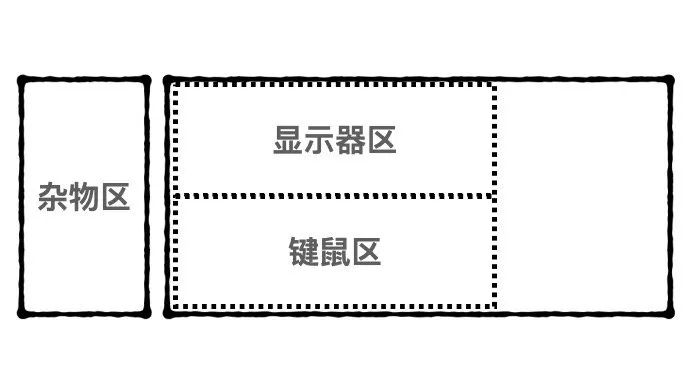在完成了视觉上的初步统一之后,下一步就是划分桌面区域,介于我没有抽屉来存储一些不常用的东西,我将小桌子放在大桌子左侧作为杂物区,考虑到这些不常用的物品需要做到:在平时不会出现在我的视野中但当我需要时又可以不站起来随手拿到,我将我的主要工作区域划分在大桌子的左侧八分之五的区域。