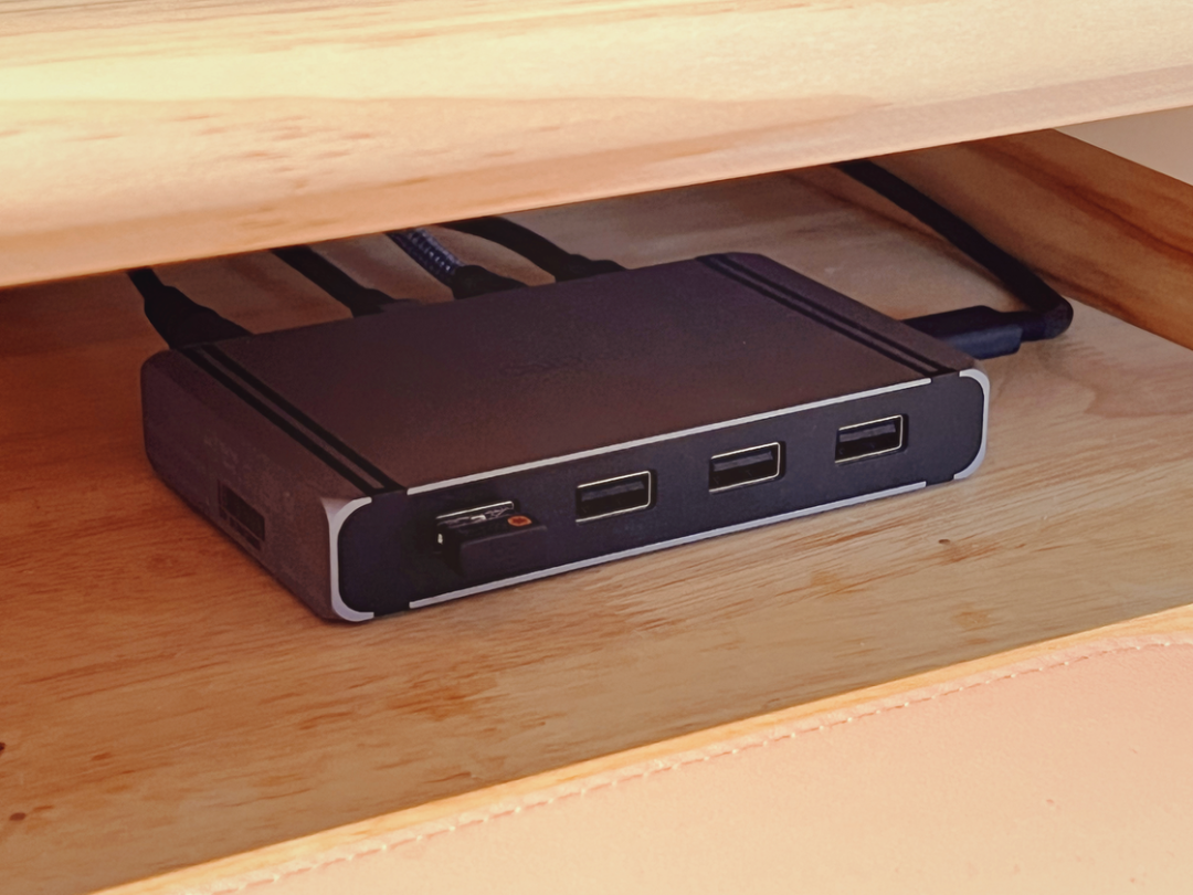 但是,要把上面这些说到的设备都连起来,也是一个麻烦事,不仅接口要足够多,而且协议也需要足够高。好在 CalDigit 推出了支持最新雷电 4 协议的 Thunderbolt 4 Element Hub 扩展坞,我只要用一根雷电线缆连接到 Mac mini 的雷电接口,就可以转接出 3 个满速的 40Gbps 雷电下行接口和 4 个 10Gbps 的 USB-A 接口,把 3 块硬盘和 1 个 4K HDR 显示器以及键鼠的接收器同时连接到电脑上。