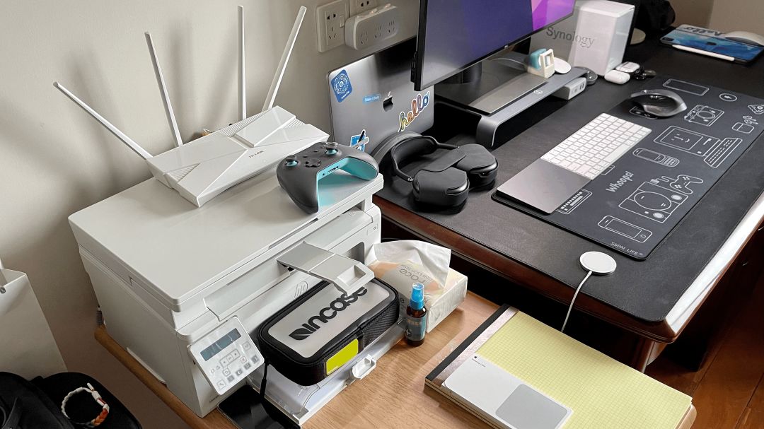 杂物桌面上最大的设备就是家里的一台上古打印机,为全家人提供一些应急的打印服务,所幸它支持 Apple 的 AirPrint,所以我用一根网线将其连接至上方的路由器以确保更加稳定的连接。