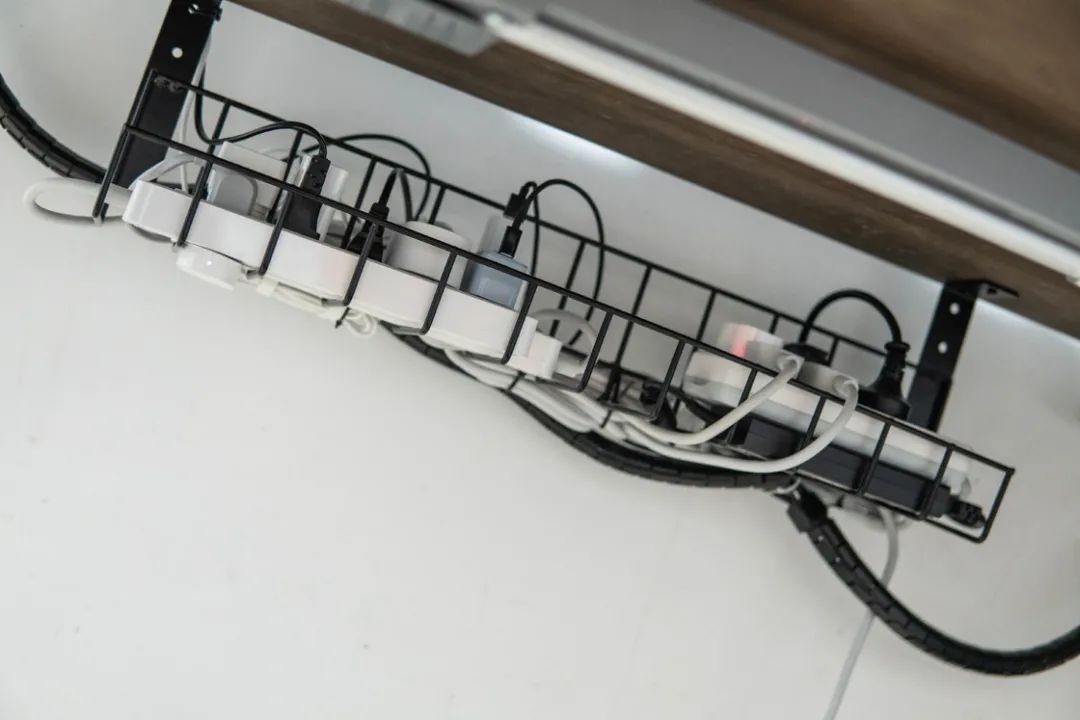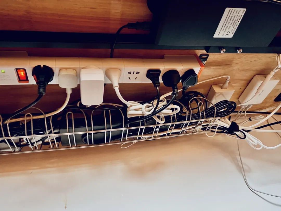 所以双十二我又购买了新的理线装备:一根 16 位的 PDU 插排,可以让堆在一起的插头看起来更清晰规整;黏在桌子下面的包线管,用以替代之前使用的传统包线管;以及新的半封闭式的收纳篮,用来收纳太长的线团和像块砖头一样的显示器变压器等碍眼的东西。