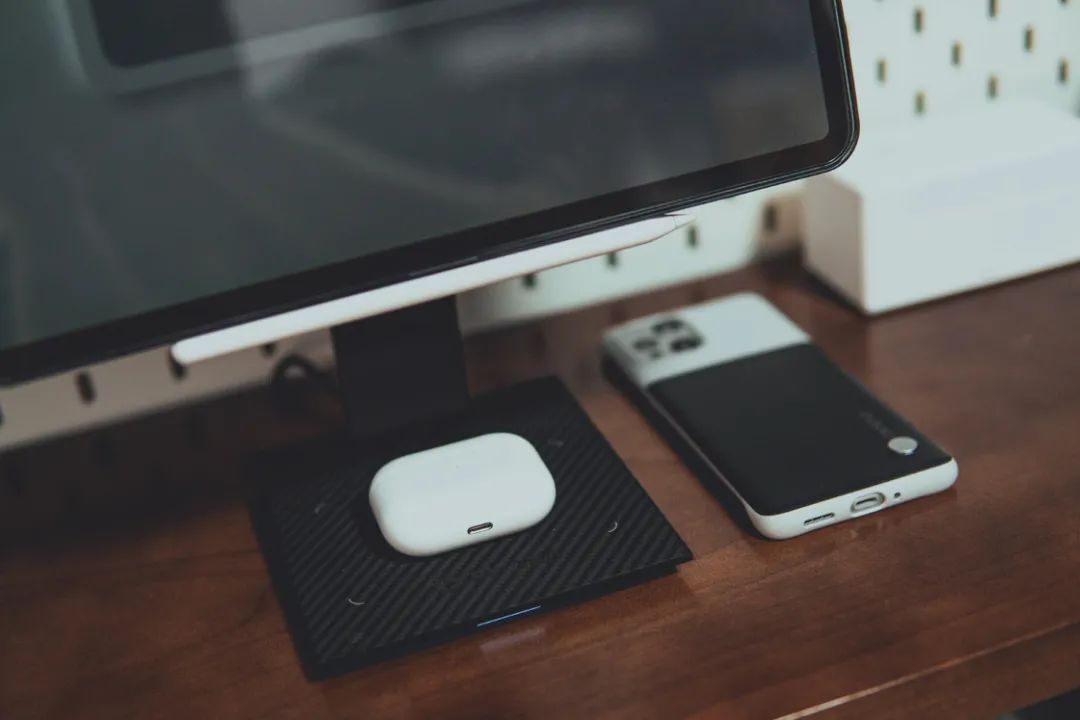 第二个途径是将无线充电与桌面上原有的一些设备来进行融合。比如 PITAKA 的 iPad 支架,底部留有一个磁吸位,我一般拿来给耳机(贝尔金三合一底下的充电位太难用了)或备用机充电: