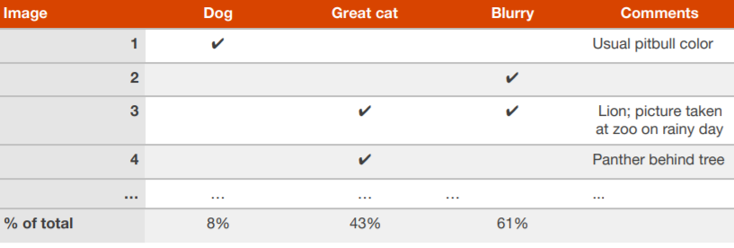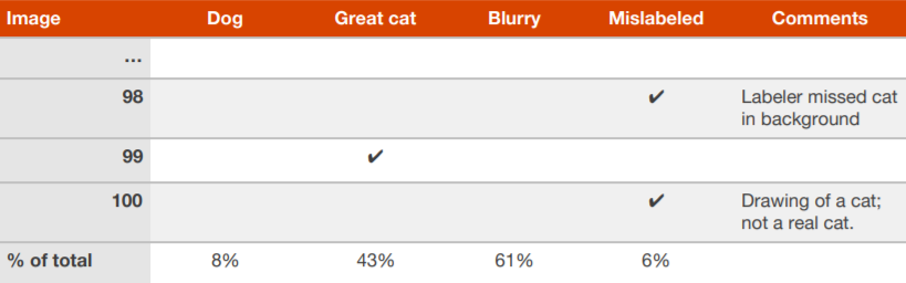 当你的团队在如何改进算法有很多想法时,你可以并行地、有效地评估这些想法。通过创建一个能够检测猫类图片的算法,吴恩达解释了他是如何创建一个表格,并在查看约 100 个错误分类的开发 / 测试集图像时填写表格,如下图所示。