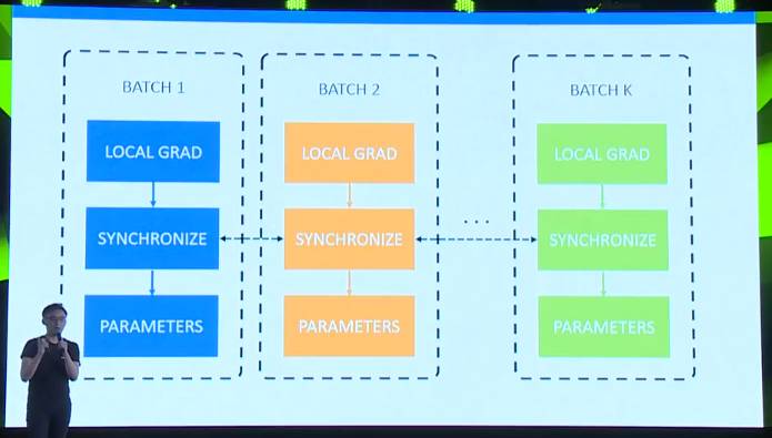 一个信息:ResNet-50一共有2千5百万个参数需要算导数并同步。那么在计算机里,大约是100MB的大小。这在今天这个时代,听起来不是什么海量数据。