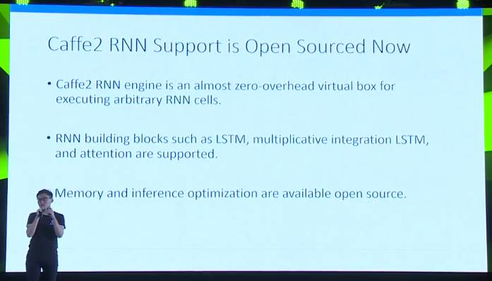 更值得兴奋的是,我们从上个月开始开源了我们的循环神经网络支持。开源社区和在座的每一位也可以开始用Caffe2来优化你的循环神经网络。从框架本身,调用Caffe2的循环网络引擎对性能几乎没有影响。Caffe2支持主流的循环神经网络单元包括LSTM,Multiplicative Integration LSTM(这是一种在单元里面加上乘法的更复杂的LSTM单元)和带attention的模型等。之前我提到的内存和正向推导时的优化,都已经开源。
