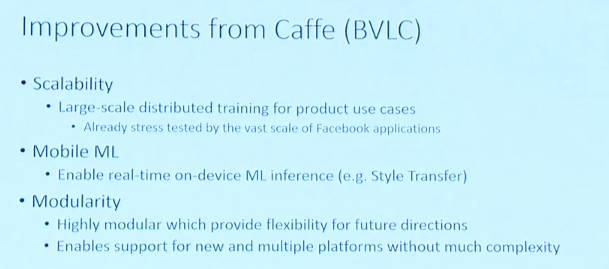 1.Caffe2有更好的规模拓展性。今天的演讲里也给大家加少了很多大规模训练的例子,比如翻译,比如imagenet-1k in an hour。这些大规模训练的例子都已经在Facebook级别的数据量和系统上经过了实战检验。