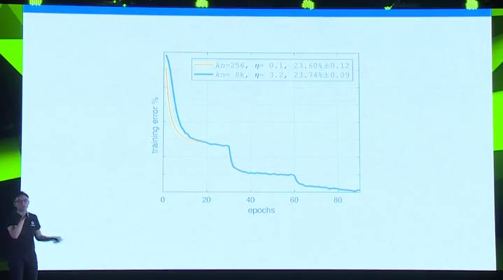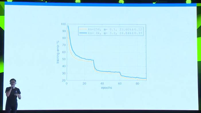 那么经过我们同事的一番探索,在一番努力后,我们找到了一种循序增大学习效率的办法,使得分布式的训练曲线和我们目标的标准训练曲线收敛在一样的训练错误率上。我们总结了一系列在大规模分布式上训练神经网络的经验,更多的内容可以到我们的论文中查看。