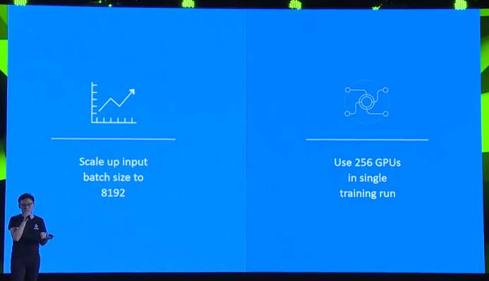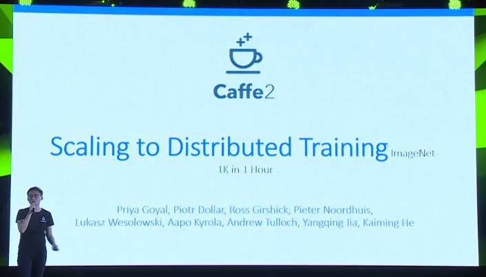 在这项任务里,我们把本来需要好几天的训练量,用1个小时的时间训练完了。而且我们用的是全开源的软件框架,深度学习用Caffe2,网络调度同步用我们开源的gloo,硬件就是你也能买得到的英伟达的GPU。