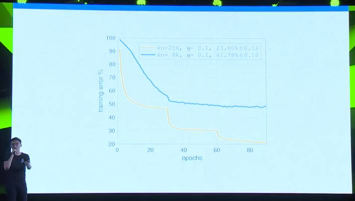 因为我们期待能够在分布式的机群上做数据并行的训练,意味着我们单次处理的数据量要远大于标准的256张图片。那么假设我们直接把单次处理的数据量增加到8192张,会发生什么呢?我们就得到了蓝色的训练曲线。在大约90期数据后,模型的训练错误率大约停在41%左右。这两者之间的差距很大。蓝色的训练曲线完全不达标。(但值得一提的是,在一个1000类的分类任务中,如果我们只有一个随机分类器,我们的训练错误率大概在99.9%左右。这个模型虽然和我们心中标准差了很多,但他显然是具备一点关于这些图像上分类的知识的)