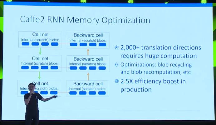 我们介绍了我们在自然语言处理领域, 也就是我们机器翻译的成果。Caffe2对循环神经网络做了许多优化,使得我们训练的模型经受起了45亿级别的单日访问量的考验