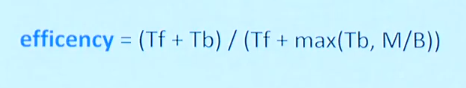 他的分子上是两项时间的相加。Tf代表在神经网络正向运算的时候消耗的时间,Tb代表反向运算的时间。这两项时间相加代表了在假象的完美的0同步时间系统中训练需要的时间。分母上第一项依然是正向时间Tf,第二项是反向时间和同步时间的最大值。同步时间由我们需要传输的数据量M除以系统带宽B得到。之所以在返乡时间和同步时间取最大值是因为神经网络参数反向运算是有序的。在算完了反向第一层的参数导数后我们就能开始同步。