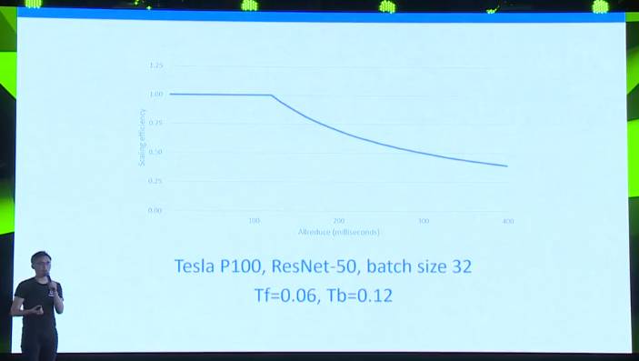 如果我们把实际的数据带入到上一页的公式中。在Tesla P100上resnet单次处理32张图片,正向时间大概是0.06秒,60ms,反向时间120ms。那么如果我们这个系统想要达到50%的同步效率,也就是理论上起码一半的时间在做主要的训练工作,我们必须得在200ms中完成256台机器的本地导数全相加同步。这时候,100MB看起来就很多了。