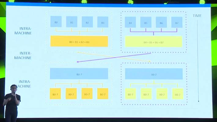 针对同步我们做了很多优化。比如我们做了多层次的同步。我们会在第一步先在机器本地把GPU们的数据做一次全相加。在图里比如左上方,就是把四张GPU卡的数据合并。第二步我们通过互相拷贝做机器间的全相加同步。第三步我们把计算出的统一数据再在机器内部分发到所有GPU上。