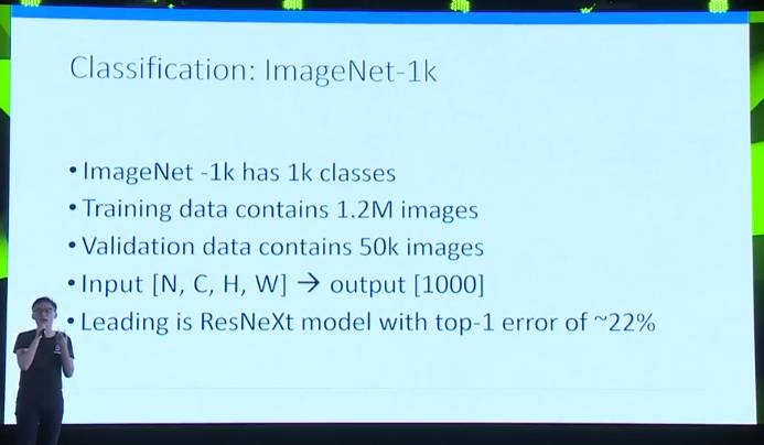 输入的格式是NCHW -》输出是1 hot label的形式。现在学术届在这个数据集上最领先的是我们FB的同事 kaiming大神的工作:rextnet,大概达到了22%的训练错误率。也就是说,给模型看100张来自ImgeNet训练集的图片,他期望上能说对其中78张图片的类别。相较于2012年AlexNet横空出世时的36-40的top1 error rate,我们深度学习的研究者已经有了很大的进步。