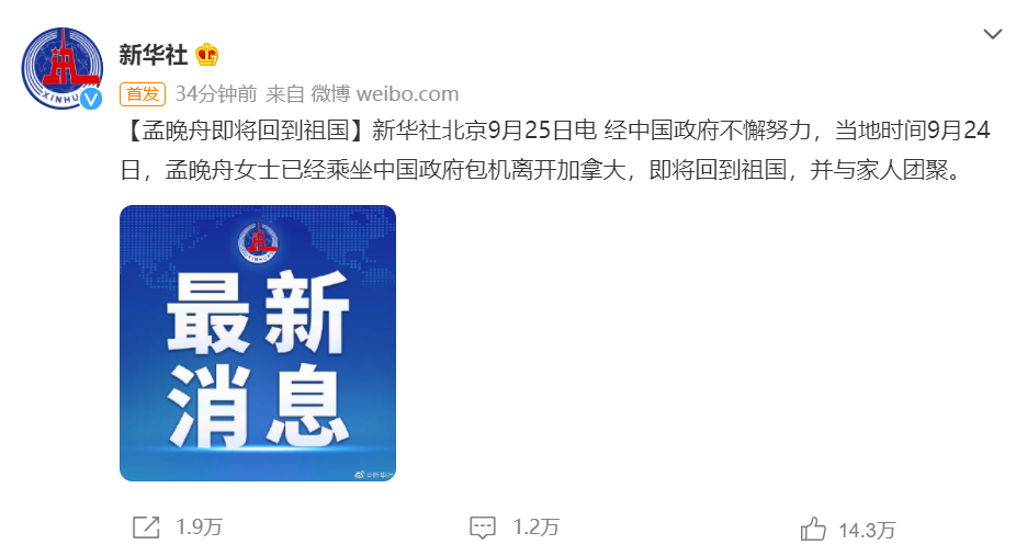 根据近日报道,经过了中国政府的不懈努力下,当地时间 9 月 24 日,孟晚舟女士已经乘坐中国政府包机离开加拿大并且已于今晚 21:45 回到祖国,已与家人团聚。