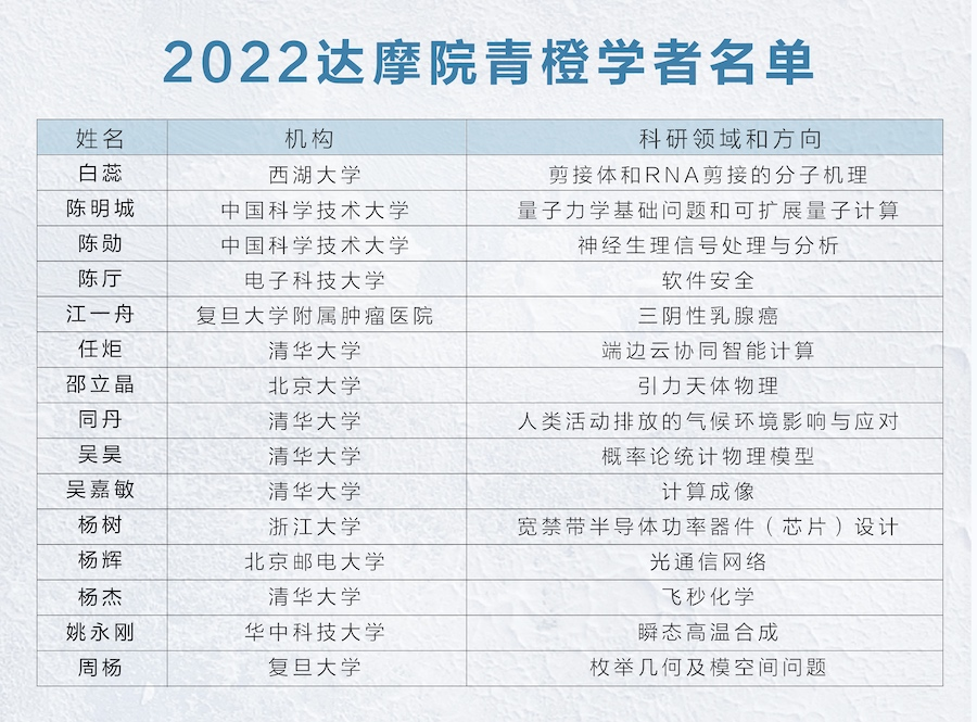 2022 年 10 月 31 日,第五届达摩院青橙奖名单公布,白蕊、陈明城、陈勋、陈厅和江一舟等 15 位中国青年科学家获奖,每位获奖者将获得可任意支配的税前 100 万元奖金以及阿里巴巴全方位科研支持。