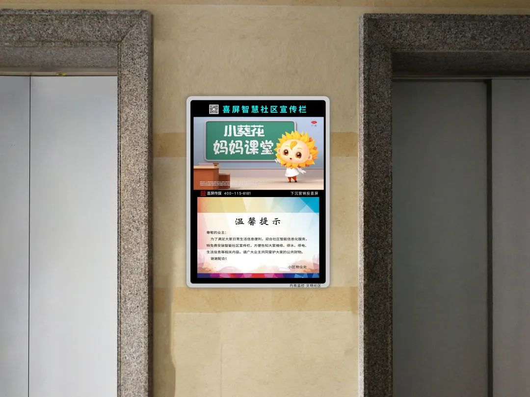 一是,喜屏自我研发的专利产品——“智慧社区宣传栏”,通过跟物业信息发布系统打通,帮助物业免费发布停水、停电、物业催缴、防疫信息等内容;也可以帮助业主免费发布房屋出租、车位转让、寻物启事等信息,这个产品广受物业公司好评,国内优秀的物业公司70%跟喜屏都有合作。既可赋能物业和业主,也有助我们低成本进入社区。