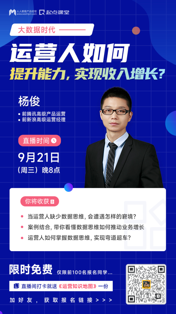 由人人都是产品经理&起点课堂出品,专为0-3年运营从业、想转岗运营的职场人、想入职运营的大学生量身打造的体验课,由起点课堂-特聘讲师@杨俊老师主讲。